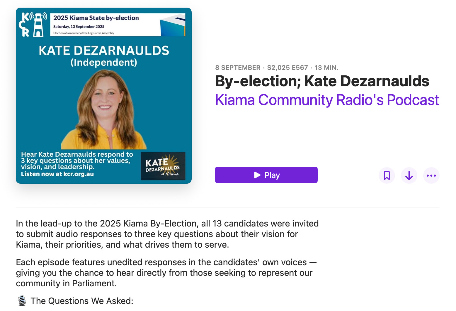 In the lead-up to the 2025 Kiama By-Election, all 13 candidates were invited to submit audio responses to three key questions about their vision for Kiama, their priorities, and what drives them to serve.